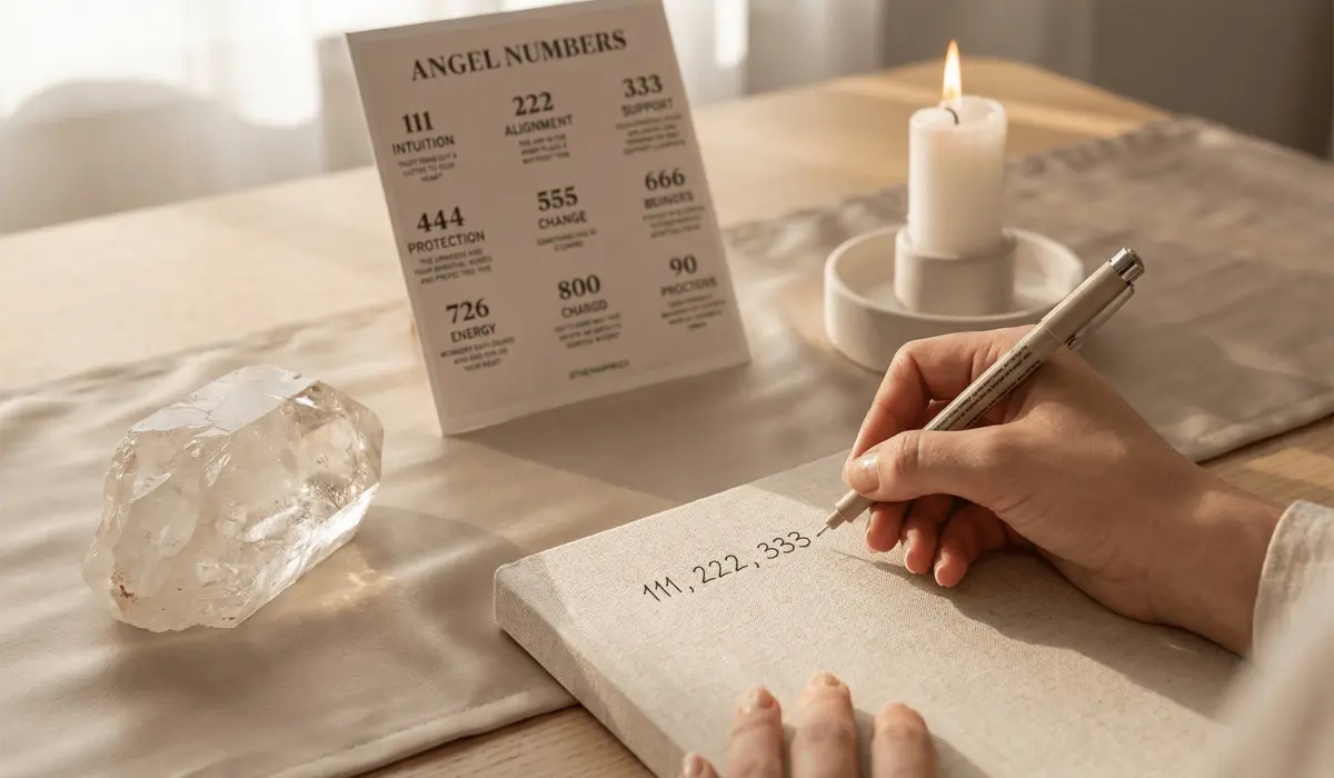 A spiritual workspace setup for angel number calculation featuring a journal, quartz crystal, sage smudge stick, and numerology charts.